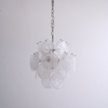 Ätherisch und raffiniert, zeigt dieser Kronleuchter handgeblasene Murano-Glas-Scheiben, die in einer schwebenden, skulpturalen Silhouette geschichtet sind. Jede milchig-weiße Scheibe fängt das Licht sanft ein und streut es, wodurch ein ruhiger, wolkenähnlicher Schein entsteht. Die sanften Wirbel und die durchscheinende Oberfläche verleihen eine künstlerische Dimension und verwandeln jeden Raum mit ambienter Wärme und visueller Attraktivität.
