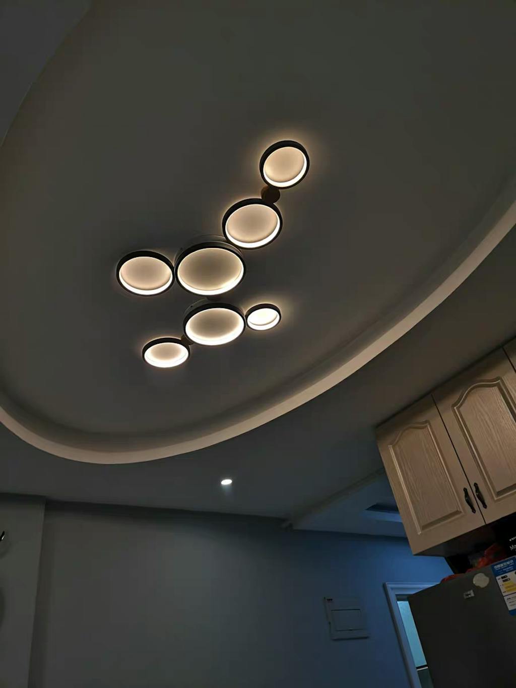 - Das spielerische Design der runden Scheibe der Leuchte bietet vielfältige Beleuchtungsoptionen mit 3, 4, 5, 6 oder 7 Köpfen.