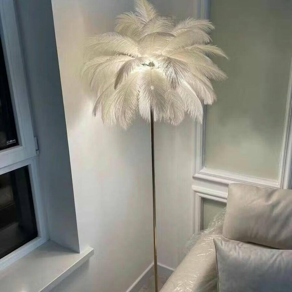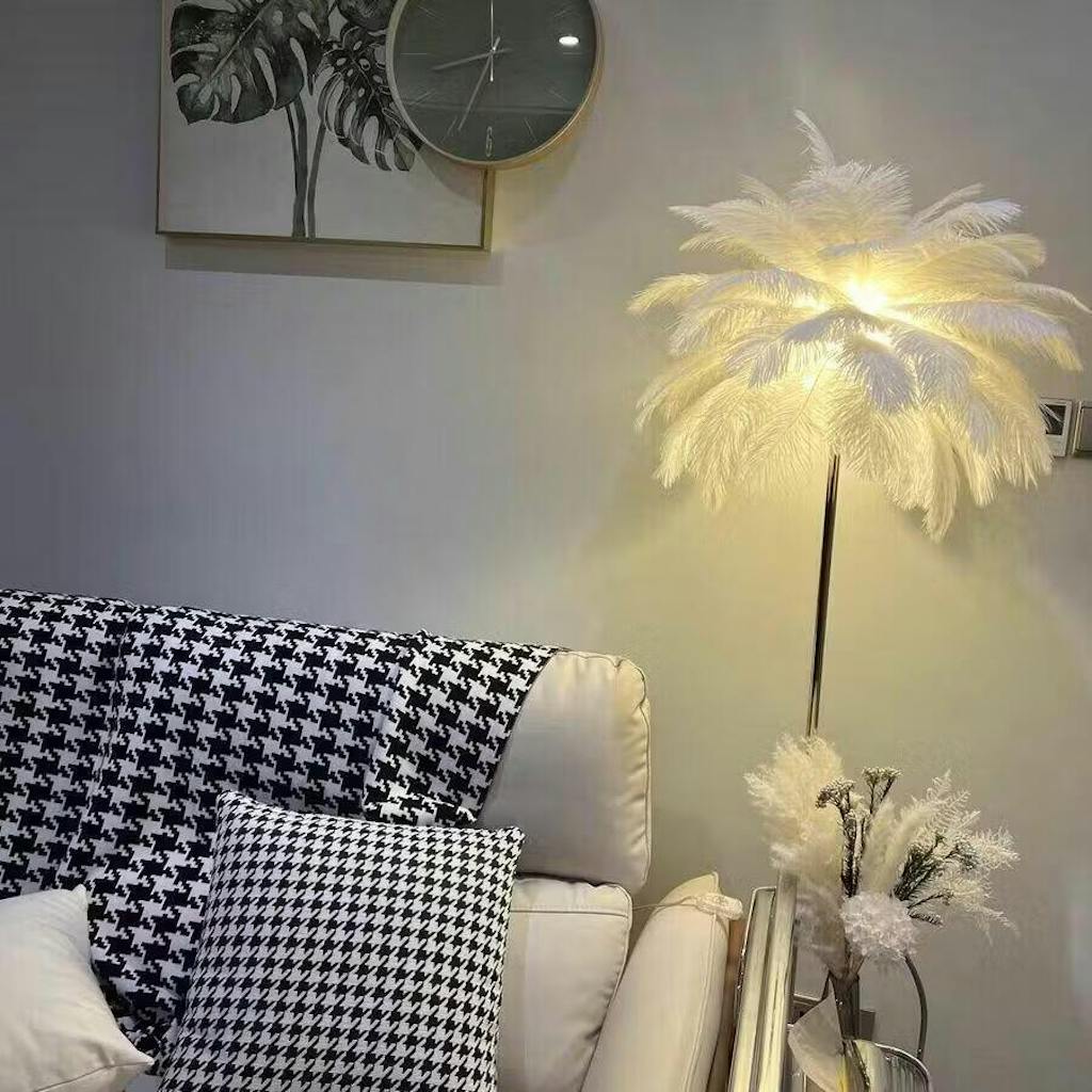Die Stehlampe aus Metall und Federn ist robust, langlebig und verfügt über eine angenehme haptische Textur.