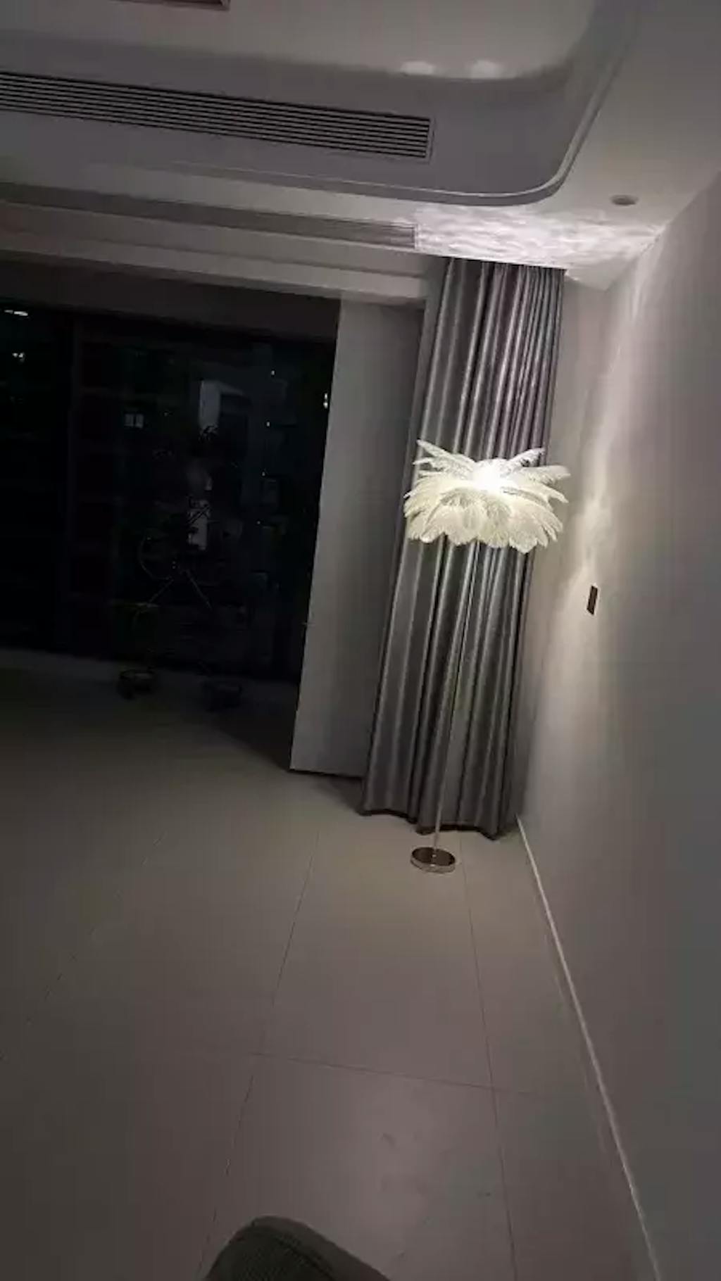 - Die Stehlampe zeichnet sich durch ihre vertikale Form aus, die ein Gefühl von Raum und Höhe vermittelt. Der Lampenschirm ist von Federn inspiriert und wirkt leicht und elegant, während der Lampenfuß stabil und langlebig ist, was der Lampe Stabilität verleiht.